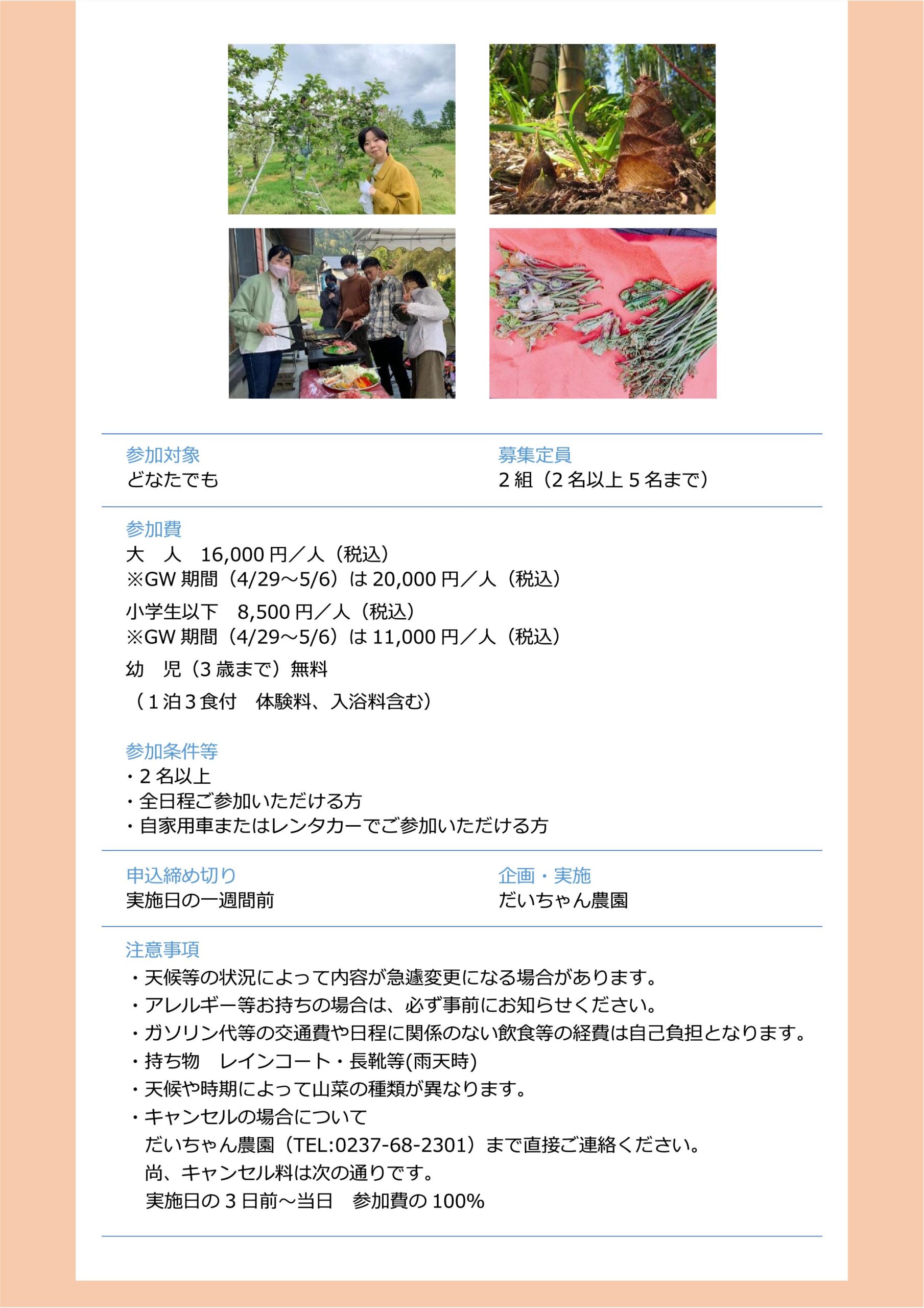 春を感じる農作業体験や、山菜採りなどが体験できるほか、BBQ、山菜料理も味わうことができます。